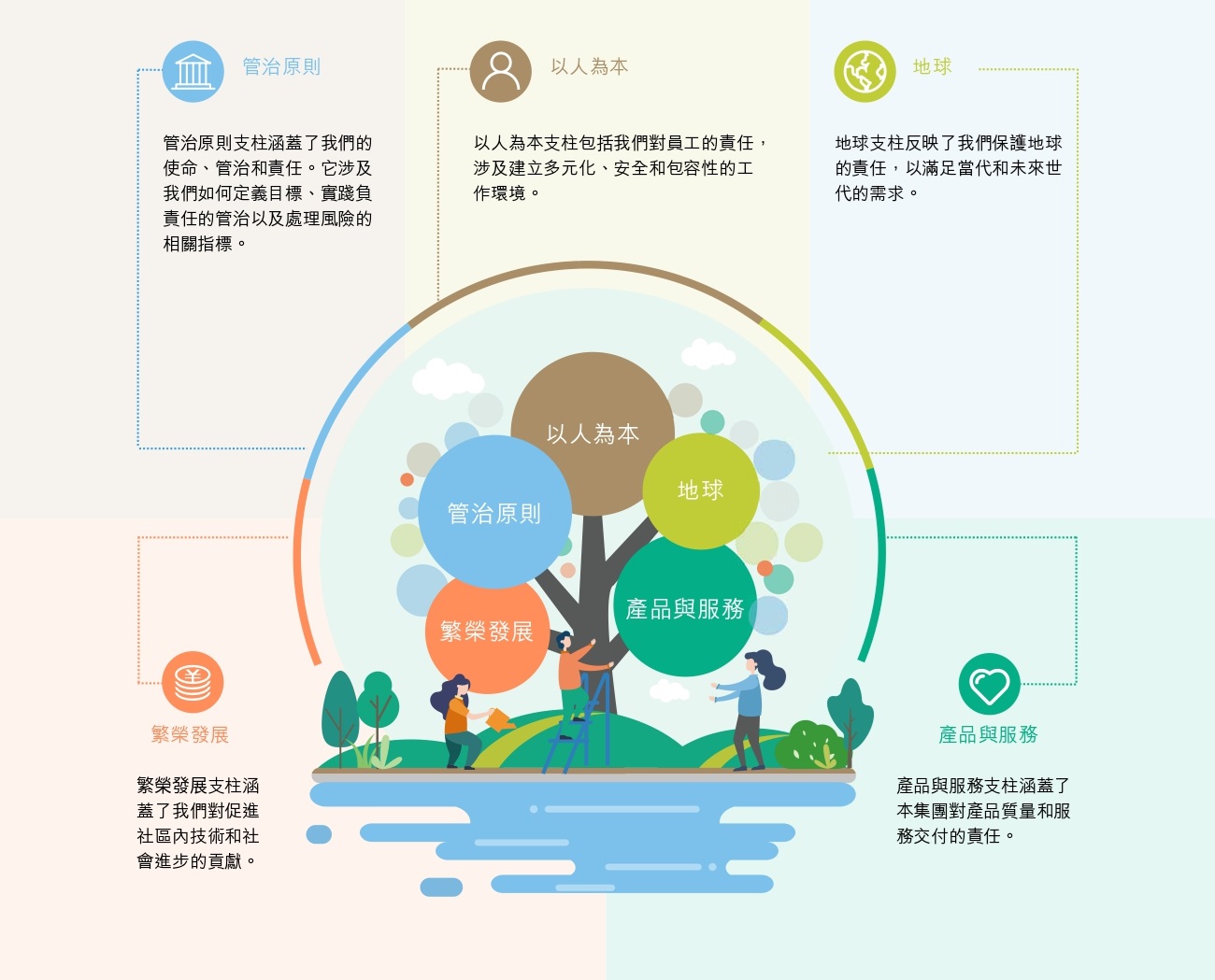 在本年度,我们引入了本集团的5P可持续框架,以加强可持续发展管治并推动ESG文化。该框架受世界经济论坛的共同指标启发,由五个对本集团可持续性和业务连续性至关重要的支柱组成。